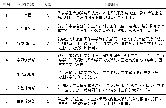 為落實(shí)共青團(tuán)中央、教育部、全國(guó)學(xué)聯(lián)聯(lián)合下發(fā)的《關(guān)于推動(dòng)高校學(xué)生會(huì)(研究生會(huì))深化改革的若干意見(jiàn)》,并結(jié)合《關(guān)于鞏固高校學(xué)生會(huì)(研究生會(huì))改革成果的若干措施》文件要求,接受廣大師生監(jiān)督,現(xiàn)將我校2023—2024學(xué)年學(xué)生會(huì)(研究生會(huì))改革情況公開(kāi)如下。