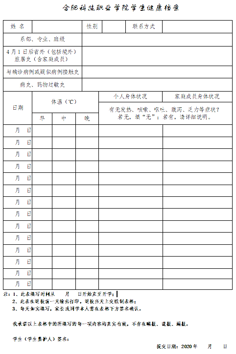 返校學生必須嚴格履行報批手續(xù),并于正式返校前兩周開始填寫《學生健康檔案》,所填信息必須如實、準確、詳細,不得隱瞞謊報(必須手寫填報)。